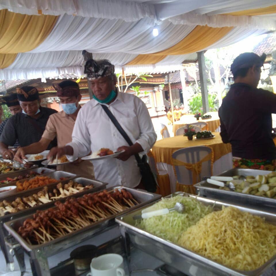 Risa catering melayani catering prasmanan, pada acara pernikahan di Gianyar, Bali yang dilaksanakan pada tanggal 2 April 2021. Pada acara ini, kami melayani jasa catering prasmanan untuk melayani 350 porsi tamu undangan. Menu yang dihidangkan pada acara ini adalah menu makanan khas Bali, diantaranya sebagai berikut:
