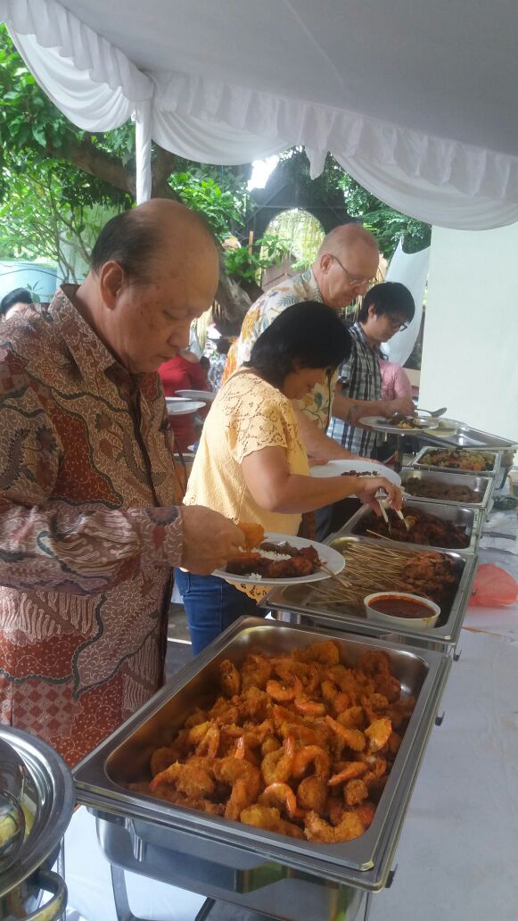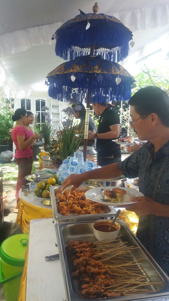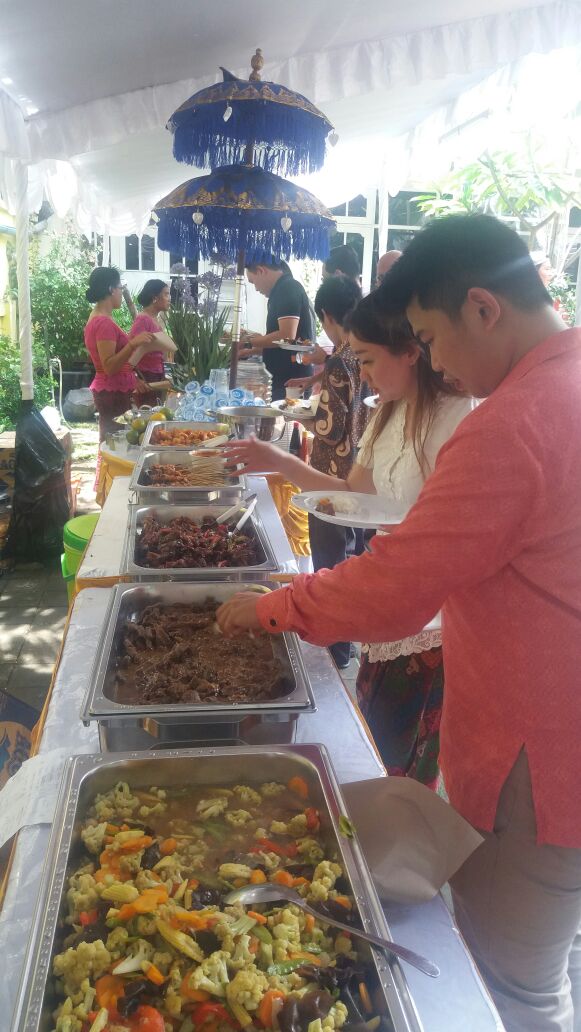 Risa catering melayani catering prasmanan, pada acara Catering Pernikahan di Renon, Denpasar yang dilaksanakan pada tanggal 26 November 2017. Pada acara pernikahan ini, kami melayani jasa catering pernikahan untuk melayani 300 porsi tamu undangan. Menu yang dihidangkan pada acara ini antara lain: blayag, ayam, udang, sate lilit, sate tusuk, capcay, bakso, mie goreng, ayam kecap, air aqua, buah jeruk, kerupuk, dan sambal. Berikut adalah foto dokumentasi Catering Pernikahan di Renon, Denpasar